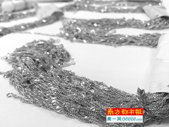 昨日,南都记者在深圳市旅游汽车出租有限公司的前台看到这堆金项链,都是千足金,据目测估计,至少300多条,而其总重也超过1千克。即使不算加工设计费,按现在金价这些金项链也超过25万元。古语说“拾金不昧”,现在阳柏建算是做了个现身说法。