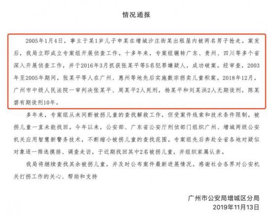 11月13日,广州市公安局增城区分局发布通报称,2003年至2005年期间,张某平等人在广州、惠州等地先后实施数宗拐卖儿童积案,警方于近期找回其中两名被拐儿童。