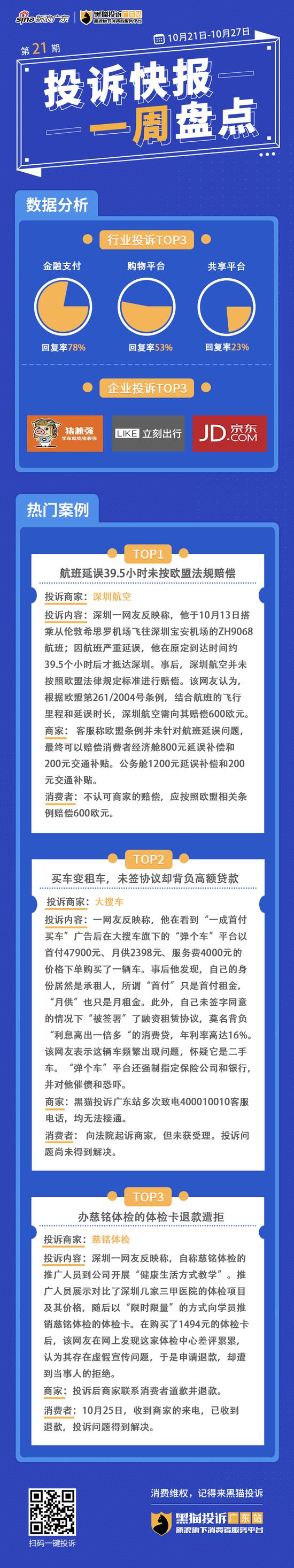 深圳航空一航班延误39.5小时 未按照欧盟法规赔偿;网友在“弹个车”买车变租车 未签协议却背负高额贷款;慈铭体检机构上门推销体检卡 退款却困难重重...上周黑猫投诉广东站投诉TOP企业为@猪兼强官微 @立刻出行官方微博 @京东 更多详情戳下图↓↓↓
