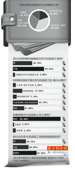 你所在单位每月何时发工资?省人社厅最近公布《广东省工资支付条例(征求意见稿)》,拟规定企业工资属按月支付的,发薪日不得迟于次月10日。而且,用人单位无法定理由逾期未支付或未足额支付劳动者应得工资,将被认定为拖欠工资,最高罚款20万元。南方都市报昨日发起微调查显示,仅两成单位目前是10日前发工资,近八成受访者不看好这个政策能顺利实行。