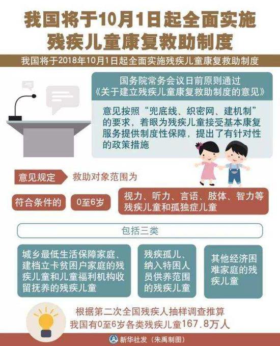 今年7月,国务院正式印发《关于建立残疾儿童康复救助制度的意见》,决定自2018年10月1日起全面实施残疾儿童康复救助制度。意见提出到2020年,建立与全面建成小康社会目标相适应的残疾儿童康复救助制度体系,基本实现残疾儿童应救尽救;到2025年,残疾儿童康复救助制度体系更加健全完善,残疾儿童普遍享有基本康复服务,健康成长、全面发展权益得到有效保障。