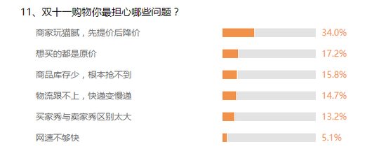双十一买的开心固然重要,但是价格低、质量有保证才是消费者更为关心的。调查发现,用户最担心的是“商家玩猫腻,先提价后降价”,也有不少用户担心自己想买都是原价!不想买的却在降价,而对于网速不够快的问题貌似大家好像不是很担心,看来打击网速都是扛扛的!