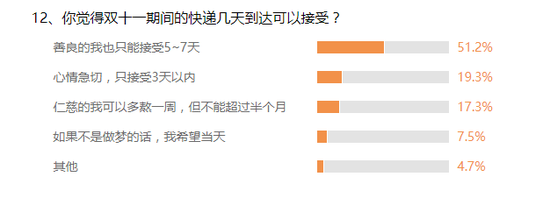 关于用户对快递的忍耐值,大约一半的用户均选择“善良的我也只能接受5-7天”,而可以熬过半个月用户仅有17%,虽说对双11的快递早已降低了心里预期,但大部分用户还是希望别因为买的多就阻挡自己收货的速度,毕竟拆快递的时候女神都能成为女汉子的。