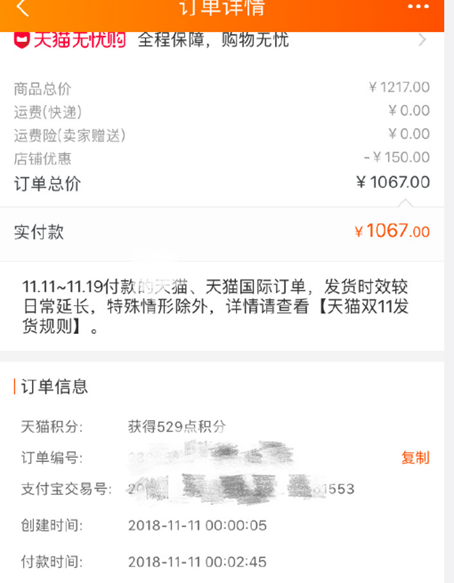 新浪广东快投诉了解到,根据《天猫双十一发货规则》:天猫订单须在11月20日23:59:59前发货,否则按照延迟发货违规处理。