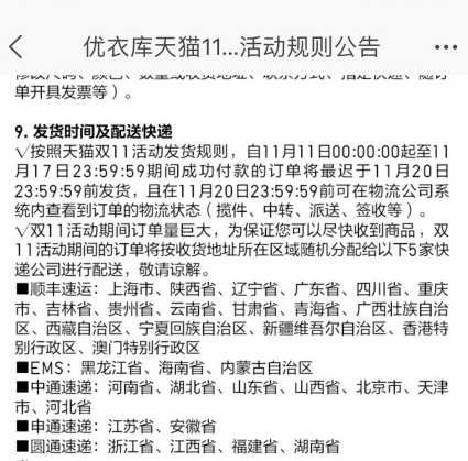 优衣库天猫双11活动规则公告关于“发货时间及配送快递”的截图11月27日,消费者丁女士向新浪广东快投诉反馈,衣服已发货,因发货延迟,优衣库按照天猫规定以积分形式补偿,共补偿了3万个积分(注:天猫100个积分可抵扣1元)及174元现金。