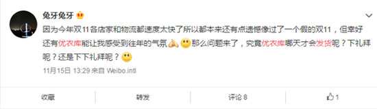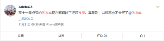 有不少网友反馈“优衣库双11延迟发货”,图为部分网友的微博截图优衣库:已发货并按天猫延迟发货的规定补偿