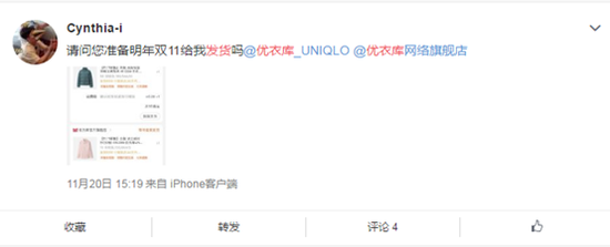 曝优衣库双11有货不发劝用户退款 官方:已发货并补偿