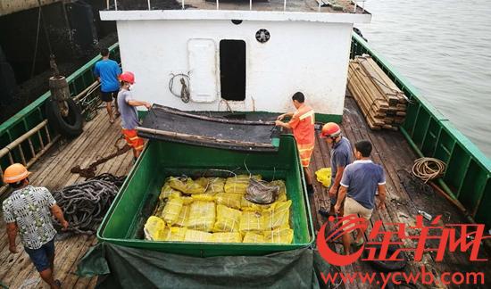 羊城晚报讯 记者李妹妍、通讯员敖玉洪摄影报道:记者从广东海警三支队获悉,该支队近日在琼州海峡附近海域查获1艘涉嫌走私铁壳船(上图),当场扣押涉嫌走私鸡爪、猪脚、猪耳朵、猪肚、猪舌等冻品300余吨,案值超千万元人民币,查获涉案人员6人。