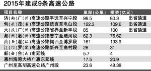 根据规划,2015年至2017年全省共建设高速公路项目72项、81个路段,共计5617公里,总投资约8391亿元。2015年全省新建成高速公路604公里(改扩建项目不算在其中)。2015年底,全省高速公路通车总里程达到6884公里,与陆路相邻省份各开通3条以上高速公路省际通道;新增8个县通高速公路,实现“县县通高速”的目标,粤东西北地区直通珠江三角洲及横贯全省的省内高速公路干线全面启动建设。