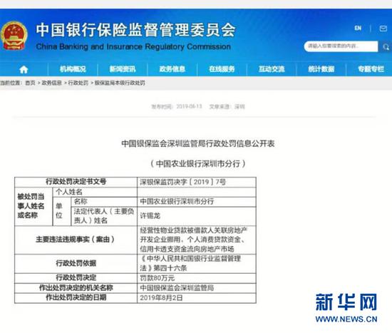 银保监管部门发布的处罚信息公开表。 新华网发行政处罚信息公开表显示,中国农业银行深圳市分行的主要违法违规事实是,经营性物业贷款被借款人关联房地产开发企业挪用,个人消费贷款资金、信用卡透支资金流向房地产市场。