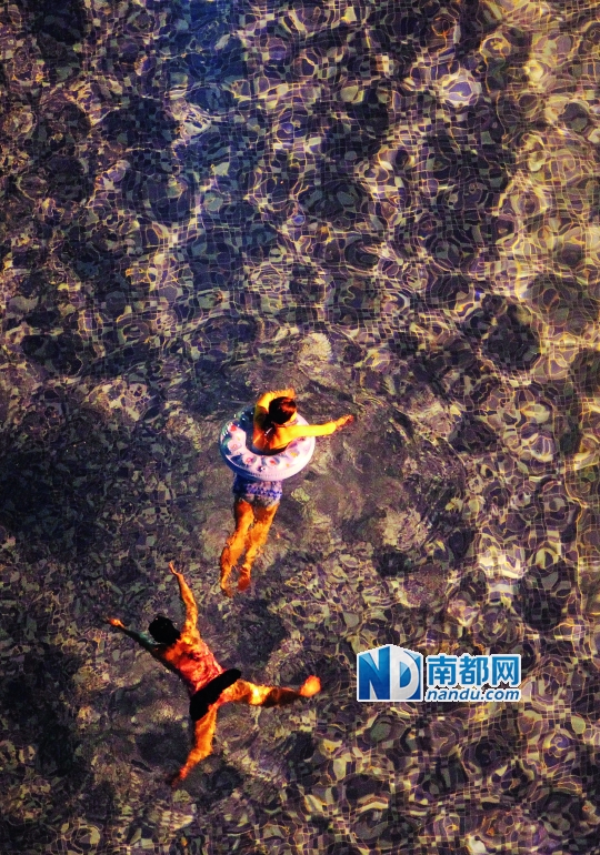 7月14日晚,珠海高温,上冲关口附近,市民在小区内的泳池内游泳消暑。 南都记者 陈坤荣 摄