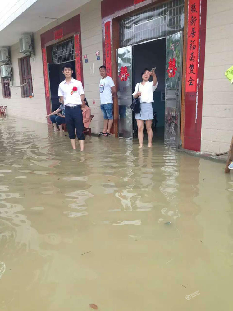 湖北新人暴雨中办婚礼 亲友漫脚积水中吃酒席