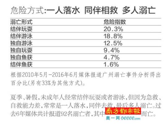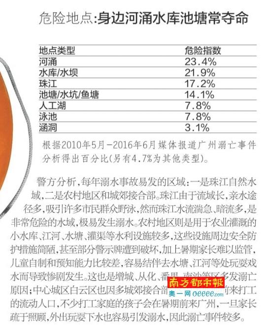 现实的案例摆在眼前,防落水、溺水在夏季期间尤为重要,南都综合以往报道,广州警方提供的数据,做出此期溺亡危险指数,提醒广大市民暑期切记防溺水。从警方提供的数据看,从2015年来一年半时间,共发生溺亡事件80宗,高发阶段集中在6、7、8月份,地点多在番禺、南沙、从化、增城等边远区域。根据媒体报道看,溺亡事件多发生在河涌、水库和珠江边。