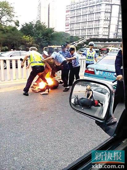 事发清城区小市嘉华路口,目击者拍下的视频显示,事发时,一辆红色男装摩托车停靠在道路中间的护栏处,车头油箱冒出火焰,有人脱下衣服扑打。离摩托车约5米处,一名白衣黑裤的男子坐在地上,裤子已多处被点燃,五六名穿制服的男子用脚猛踩,帮助其扑灭火焰。有交警一边指挥一边大叫“唔好急(不要急)”。