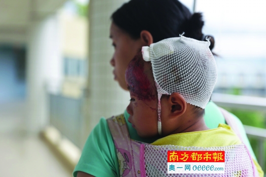 男童姓欧阳,今年4岁,家住江埔村。他头部包裹着纱布,脸上及手脚四肢均有大面积擦伤,面色尚好。