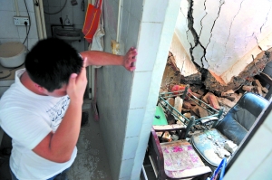 事发番禺区市桥北桥路一街8号一个类似自建屋的水泥楼房,昨日中午记者赶到现场时,当事人廖先生和妻子吴女士正一脸倦容地坐在自家对面的楼梯 口,记者看到,平房外的电线都已被剪断,门口的铁闩也被撬弯。走进家门记者看到,内部多数家具上散落着厚厚的泥尘,通往二楼的楼梯处堆积着大量水泥墙砖, 二楼和天花板都已不见踪影。“本来这里是通向二楼的,上面还有两个房间,现在都已经被拆了,现在连个睡觉的地方都没有了。”廖先生指了指正透着阳光的房 顶,无奈地说。