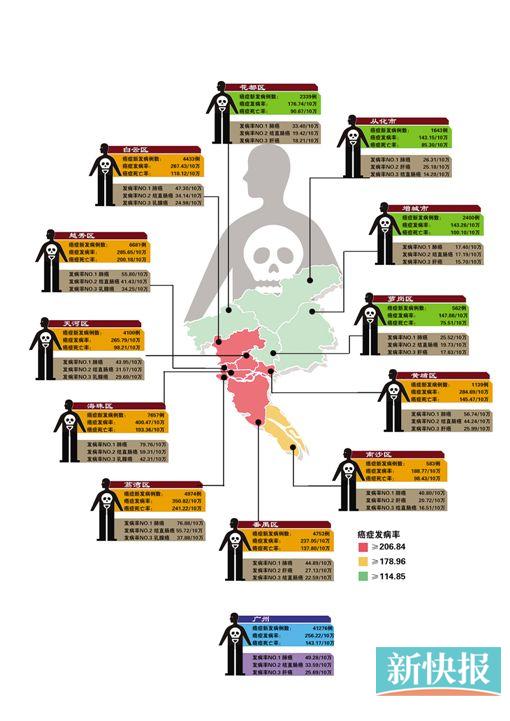 发病率排在第二的荔湾区,癌症死亡率居于首位,高达241.22/10万,全区每年近2500人死于癌症。越秀区居第二位,癌症死亡率为200.18/10万;发病率第一的海珠区则名列第三,死亡率193.36/10万。在发病率高企的肺癌、结直肠癌、乳腺癌三类恶性肿瘤中,荔湾区的存活率都是全市最低。萝岗区和从化市的癌症死亡率最低,分别为75.51/10万和85.30/10万。