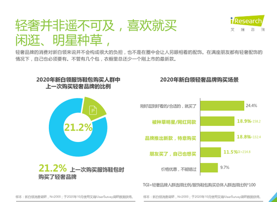 近日,在广发银行发现精彩生态战略发布会上,“发现精彩”联合艾瑞咨询发布的《2020年新白领消费行为研究报告》指出,18.9%的新白领群体在购买轻奢品牌时更愿意被种草明星或网红同款。