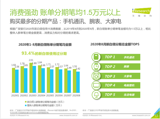 报告显示,71.4%的新白领人群选择使用信用卡支付近一半的日常消费,仅次于支付宝花呗。根据广发银行2020年新白领信用卡消费数据,从2019年8月到2020年8月,新白领账单分期单笔金额均为1.7万以上,购买最多的为手机、腕表、大家电等“硬货”类分期产品,相比整体人群单笔分期金额更高,消费实力和对分期的需求更高。