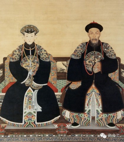 由此图也可见清代男女装有多类似。画上二人均着冬吉服,佩戴朝珠。而女冬吉服冠跟男冬吉服冠基本是完全一样的,如果女子不是戴了钿子,基本上跟男装就没太大差别。