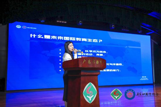省实AP外教老师Nico上台分享 美国US NEWS中方负责人上台分享面向未来,要如何构建未来国际教育生态?国际教育生态又有何特点?针对这些问题,省实AP主管张婧老师为大家分享了省实AP构建未来国际教育生态的优势和举措。