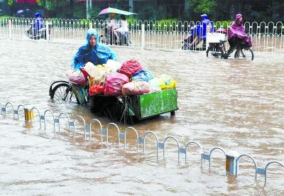 6月2日,在衡阳市船山大道,一名市民推着三轮车行进在积水的街道上。新华社发