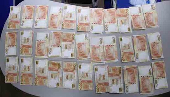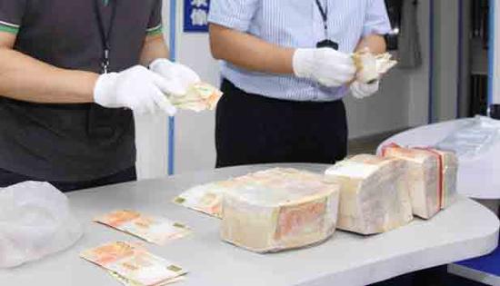 办案人员清点缴获的赎金15月15日,深圳CID办案人员通过进一步审 讯及法制教育,成功突破了犯罪嫌疑人熊某辉的心理防线。熊某辉供述,5月4日凌晨其和犯罪嫌疑人王某波从香港沙头角边境线通过翻越边境线潜回深圳,当时携 带了一个可能装有绑架赎金的黑色双肩包;回深圳后,王某波将该双肩包藏匿于深圳市罗湖区某偏僻山林。根据熊某辉供述,办案人员连夜押解熊某辉前往有关地点 进行辨认,5月16日凌晨2时许,办案人员在罗湖区某偏僻山林一处灌木丛中查获该黑色双肩包。办案人员清点发现,双肩包内装有用透明薄膜包裹千元面值的港 币4大捆,其中3捆为每捆100万元,1捆为65万元,共365万港币;还有疑似事主罗某儿被抢的戒指、项链、耳环等首饰十件。