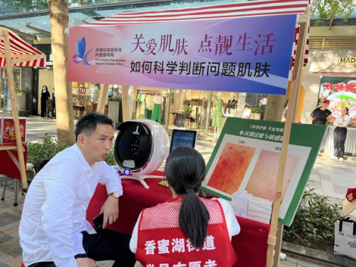5月25日下午,由深圳市市场监督管理局主办,香蜜湖街道东海社区党群服务中心协办的化妆品安全科普进社区暨“5·25爱肤日”公益活动在东海坊步行街举行。禾葡兰化妆品公司受深圳市场监督管理局邀请为社区居民科普安全用妆,如何认识肌肤问题,如何科学护肤,科学选择产品。