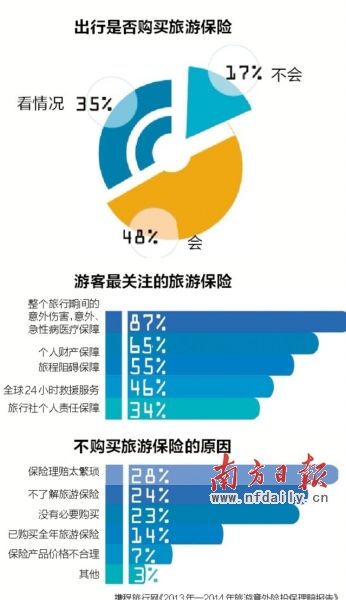 “第三类是个人意外险,我们一般会在客人报名的时候,根据行程的安全系数推荐给参团的团友,比如说有爬山、潜水等带有一定危险性的旅游项目的线路。”陈敏表示,由于这并不是强制购买的保险,目前购买个人旅游意外险的游客约有50%,主要集中在欧美等长线游产品中。陈敏还透露,团队游和自由行都会有不少人购买保险,但是自助游的很少见,基本上没有,“我们今年仅接到一位自助游客单独购买旅游保险的需求。”