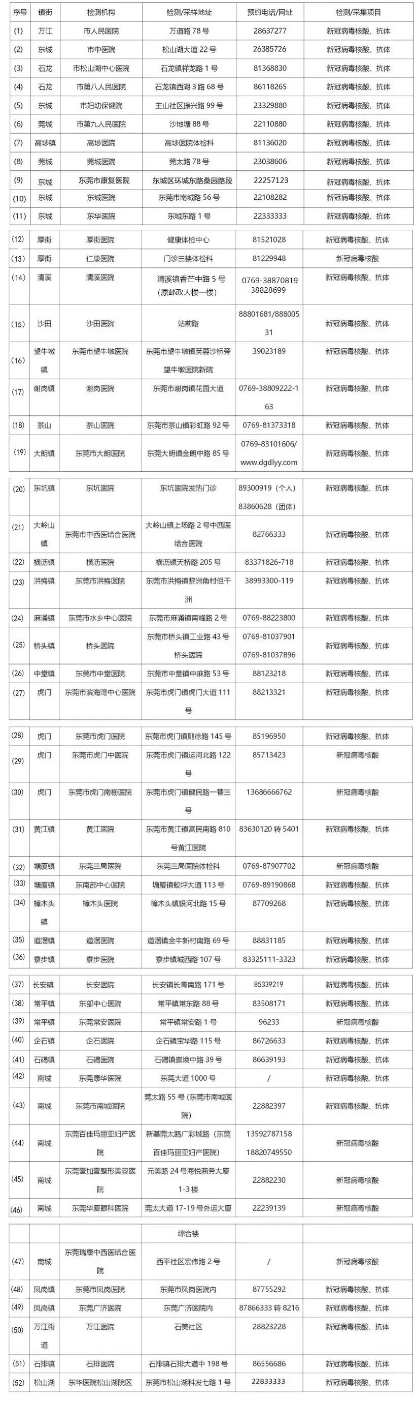 东莞市各镇街(园区)对外开展新冠病毒核酸/抗体采集医疗机构名单