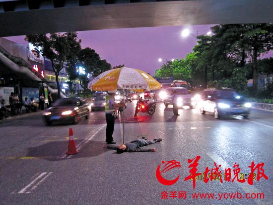 广州一男子跳桥受伤躺地 交警雨中为他撑伞(图)
