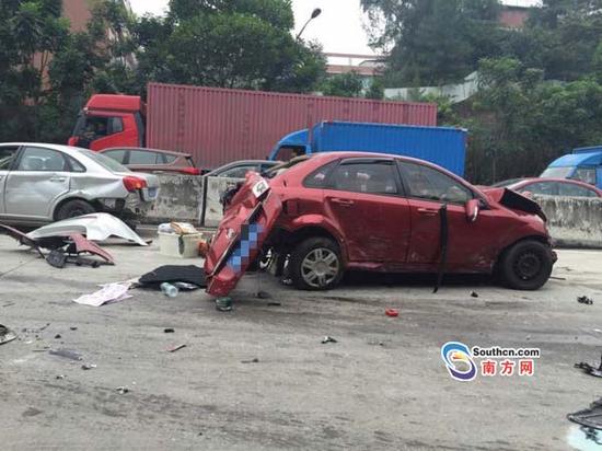 广州:华南快速沙太路收费站前6车追尾致4伤