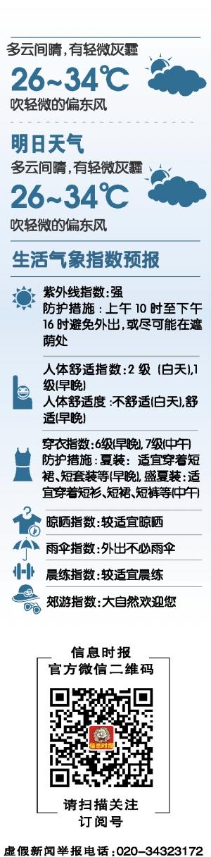 广州今日多云间晴,有轻微灰霾,气温介于26℃到34℃,吹轻微偏东风;明日多云间晴,有轻微灰霾,气温介于26℃到34℃,吹轻微的偏东风;28日,多云转大雨到暴雨,气温介于25℃到30℃。黄熙灯