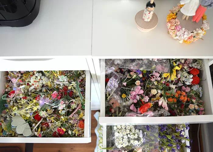▲在这个宜家的储物柜里面,大多数是Sarah为定制婚礼装置所准备的装饰品,如:花边、缎带、亮片、鲜花、微型宠物等等