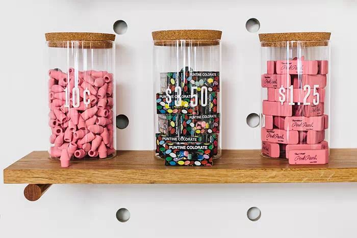 ▲The Small Object现在主要销售的是定制的橡皮图章。Sarah把邮票架漆成黄色,以便摆放橡皮图章