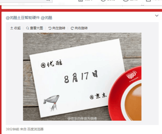 【环球网科技报道】 8月12日消息,今日京东官方微博@优酷土豆智能硬件,双方将在8月17日上午在京东的奶茶馆举办一场发布会,记者向优酷官方确认消息并没有得到明确回复,但种种迹象表明跟智能硬件有关。