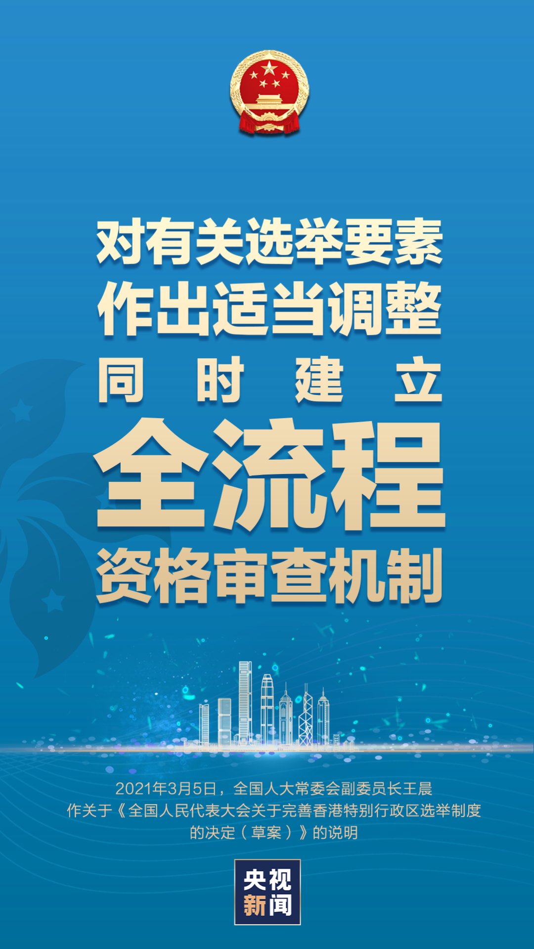 3月5日,十三届全国人大四次会议在京开幕。受全国人大常委会委托,全国人大常委会副委员长王晨作关于《全国人民代表大会关于完善香港特别行政区选举制度的决定(草案)》的说明。