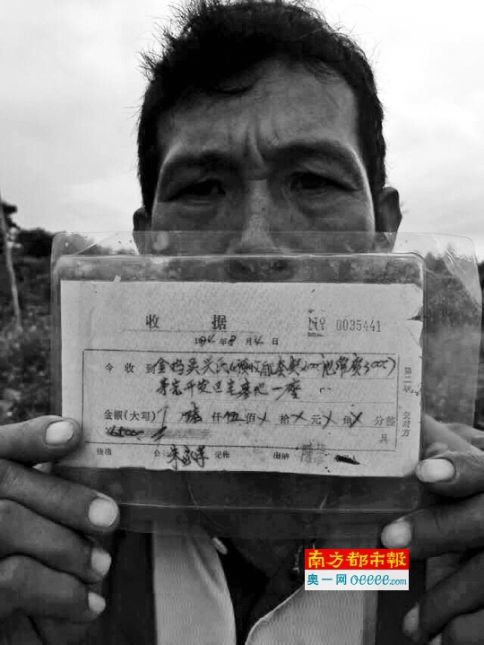 村民吴育盛拿着父亲吴兴民于1994年8月向湛江市徐闻县和安镇政府购地的收据。吴兴民已于2008年去世。