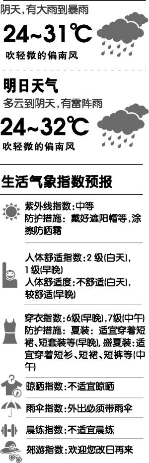 广州今日阴天,有大雨到暴雨,气温介于24℃~31℃,吹轻微的偏南风;明日多云到阴天,有雷阵雨,气温介于24℃~32℃,吹轻微的偏南风;4日,多云到阴天,有中雷雨,气温介于25℃~33℃。