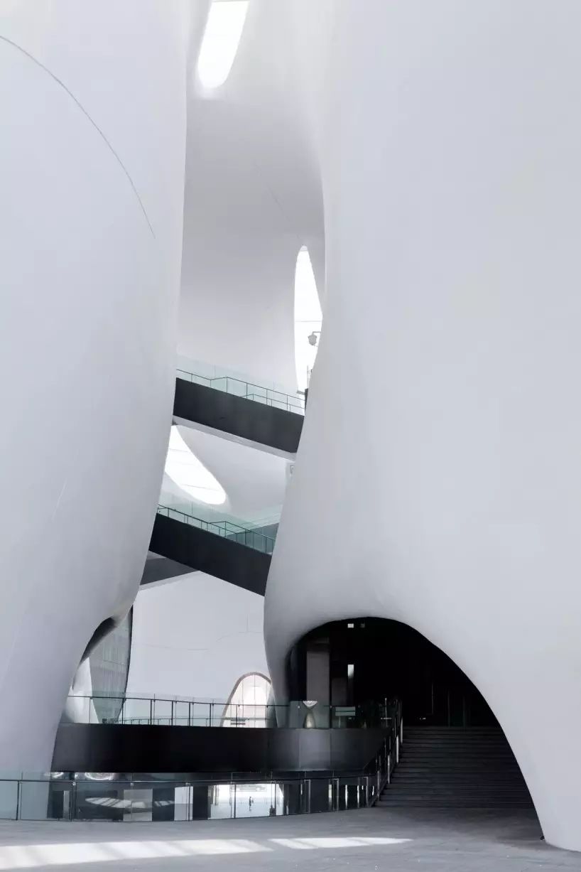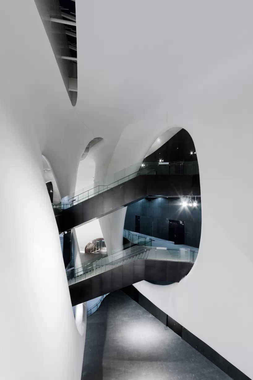 在步入博物馆内部的一刹那, 好像进入了一个明亮而巨大的洞窟,与外界的现实世界形成巨大反差的峡谷空间展现在眼前,人们在空中的连桥中穿梭,好像置身于原始而又未来的戈壁景观中。在这个明亮的峡谷空间的底层,市民可以从博物馆的两个主要入口进入并穿过博物馆而不需要进入展厅,使得博物馆内部也成为开放的城市空间的延伸。