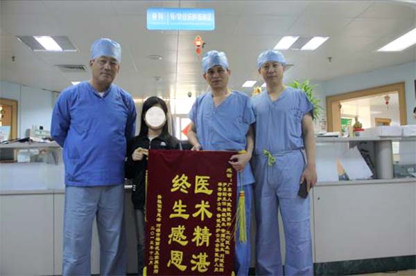 手术获成功,患者送锦旗给治疗团队(左起:刘斌、王巧民、尹东)