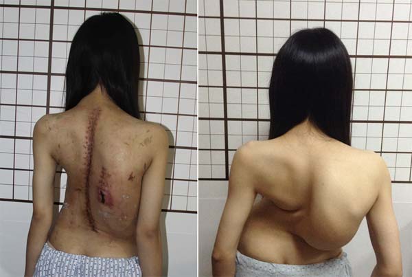 这位来自河源的小姑娘长得很秀气,但从小就因脊柱侧弯而遭受歧视。因为家庭经济困难一直没有采取有效的治疗,脊柱侧弯岁年龄增长加重,已经发展成重度脊柱侧弯。到了青年阶段,她更加渴望通过手术改善外观。这例严重的脊柱侧弯即便在有丰富经验的刘斌主任医师看来,也感到棘手。患者已经错过了最佳矫正机,骨骼僵硬且侧弯程度大,仅采用常规办法无法达到满意的效果,必须采取椎体截骨矫形的办法,术中出血及术后瘫痪的风险很高。当刘斌主任告知患者病情及手术风险时,小姑娘却也想得很清楚:“医生你放心,我既然来到你们这里,就是因为相信你们的技术。我知道手术风险很大,其实对我来说最差就是瘫痪。但我现在这样太难受了,不比瘫痪好到哪里去!万一手术做了真的有什么意外,就把遗体和器官捐赠出去!”