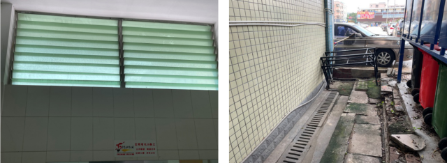 (通风窗堆满尘埃,公厕周边堆积杂物)