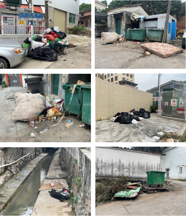 (垃圾清运不及时,乱堆放建筑垃圾、废弃家具,河道散落垃圾)